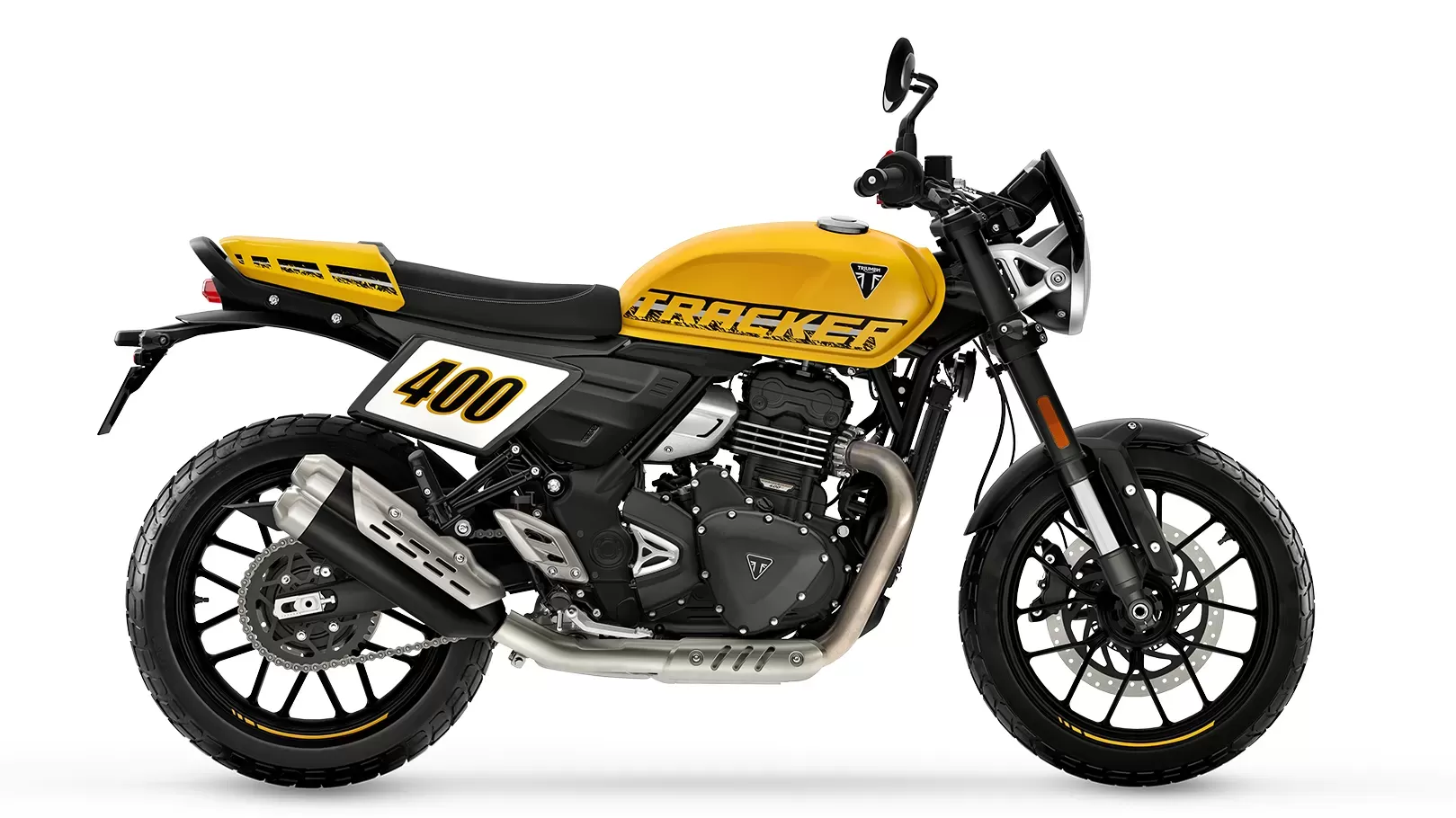 The Tracker 400 features flat and wide handlebars and repositioned footpegs for a dominating riding position. Supported by a dedicated chassis for sharper handling and an engaged rider experience. Its design incorporates a seat cowl, number board, boxy fuel tank, fly screen and newly styled wheels, paired with Pirelli MT60 RS tyres. Available in Racing Yellow, Phantom Black and Aluminium Silver Gloss, the Tracker 400 exudes flat track character and presence on the road.
